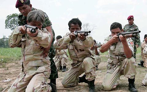 Lính Thái Lan, đội mũ nồi đỏ, dạy các tình nguyện viên cách sử dụng súng tại một ngôi làng thuộc tỉnh Surin gần biên giới với Campuchia hôm 25/4. (Ảnh: AP)