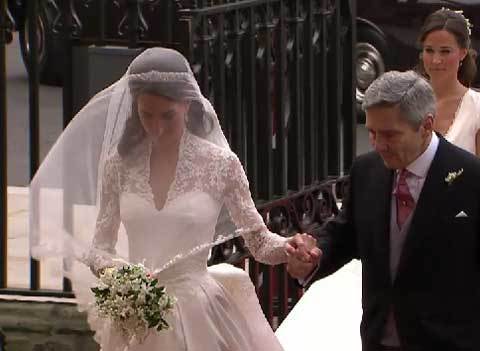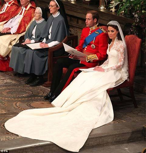 Kate mặc chiếc áo cô dâu được thiết kế rất tinh xảo, voan hai bên vai, ngực khoét sâu.