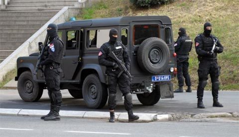 | Các thành viên lực lượng hiến binh canh gác lối vào tòa án đặc biệt về tội ác chiến tranh ở Belgrade. (Ảnh: Mail) |