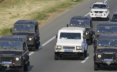 | Một đoàn xe bọc thép, với ông Mladic trong chiếc jeep trắng, áp tải ông này tới sân bay Belgrade trước khi đưa ông này sang The Hague. (Ảnh: AP) |
