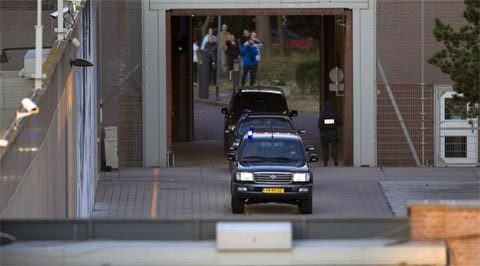 quan sát nhà tù Scheveningen của tòa án khi đoàn xe dẫn độ tướng Mladic tới nơi.