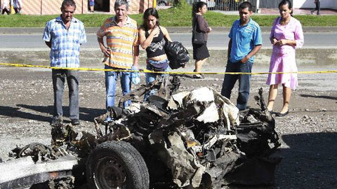 Tối 18/6, một chiếc xe mang bom đã phát nổ tại trung tâm thành phố Popayan, tỉnh Cauca, phía nam Columbia. Vụ nổ đã làm nhiều người bị thương, phá hủy hàng chục ngôi nhà cùng xe cộ xung quanh. Trong ảnh là những gì còn sót lại của chiếc xe bom.