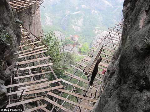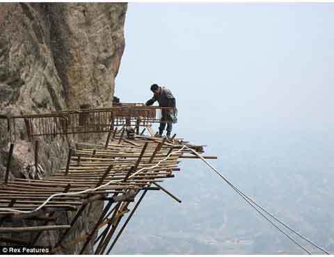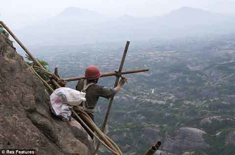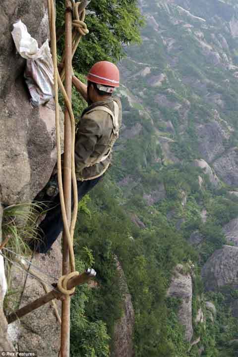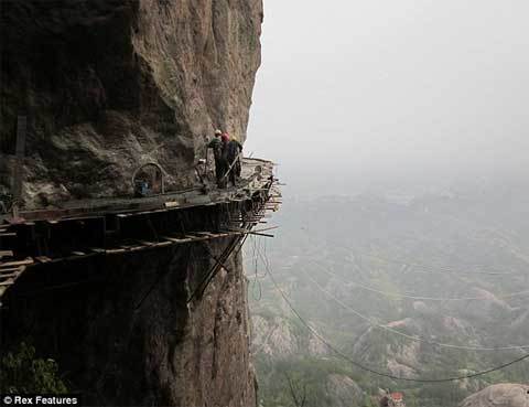 Trong khi một số người không bao giờ dám đi tới gần rìa vách đá thì những công nhân Trung Quốc dưới đây lại đang xây dựng một con đường nhỏ trên vách đá, vốn cao hàng nghìn mét so với mặt đất.