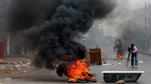 | Một nhà quay phim đang cố ghi lại hình ảnh đám cháy tại một chợ chuyên bán quần áo thuộc thành phố Karachi, Pakistan hôm 9/7. Trước đó một ngày, cảnh sát ở Karachi đã buộc phải nổ súng nhằm kiềm chế một làn sóng bạo lực kéo dài tại đây trong 4 ngày vừa qua, làm ít nhất 80 người thiệt mạng. (Ảnh: THX/Masroor). |