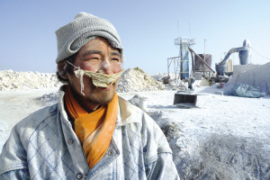 Cả xưởng Giai Nhĩ Tư bị một lớp bụi dày khoảng 20 mm bao phủ, chỉ cần một cơn gió nhẹ thổi qua cũng đủ làm bụi bám đầy lên miệng, lên mũi công nhân. Ngày 10/12, các công nhân trong xưởng vẫn làm việc cật lực, một anh công nhân mặc chiếc áo màu hồng vá chằng chịt, tay cầm một chiếc búa và đập những phiến đá rộng chừng 30 -40 cm mét vuông còn một người khác đang dùng tay xếp những tảng đá lên xe đẩy. Mất khoảng 30 phút, hai người đã xếp đầy một xe đá.