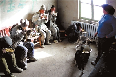 Khoảng 2 giờ chiều, bà chủ gọi công nhân tới ăn cơm. Mọi người không quen ăn cơm vào giờ này nên bà chủ gọi mấy lần họ mới tới. “Hôm nay ăn ngon hơn một tí, bên trong có mỡ đấy” – bà chủ vừa nói vừa múc một mì trong một cái nồi to đùng đặt dưới đất vào bát mọi người. Hai chú chó cứ ra ra vào vào, lúc lúc lại liếm nồi canh. Bà chủ đuổi một tiếng, hai còn chó không rời đi, bà ta cũng mặc kệ để chó ăn chung nồi với người.