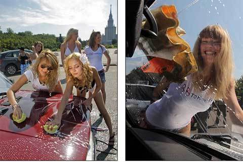 Thủ tướng Vladimir Putin cam kết "làm sạch" đất nước. Tuy nhiên, dịch vụ rửa xe miễn phí của các nữ sinh viên trong trang phục thiếu vải có lẽ là điều mà người Nga không ngờ tới.
