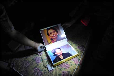 Quân nổi dậy lục soát khu nhà Bab al-Aziziya của Gaddafi đã tìm thấy những món đồ kỳ quái, gồm cả những phụ kiện thời trang của ông này và chiếc trường kỳ vàng hình người cá của con gái ông. Món đồ mới nhất họ tìm thấy là một cuốn album ảnh chất đầy ảnh của bà Rice.