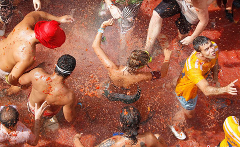 Cả thị trấn Bunol ở phía đông Tây Ban Nha chìm ngập trong màu đỏ khi hàng chục nghìn người dùng 120 tấn cà chua chín để làm "vũ khí" trong lễ hội ném cà chua La Tomatina hàng năm.