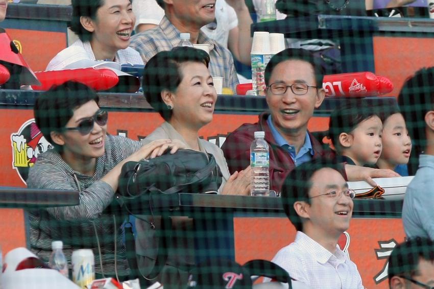 Ngày 3/9 vừa qua, trong lúc ngồi trên khán đài theo dõi thi đấu bóng chày, Tổng thống Hàn Quốc Lee Myung-bak bất ngờ quay sang hôn phu nhân của mình.
