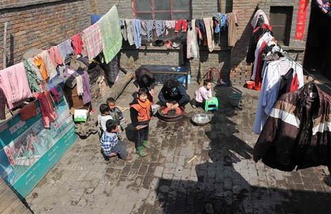 Li giặt quần áo trong khi lũ trẻ chơi quanh hôm 19/3.