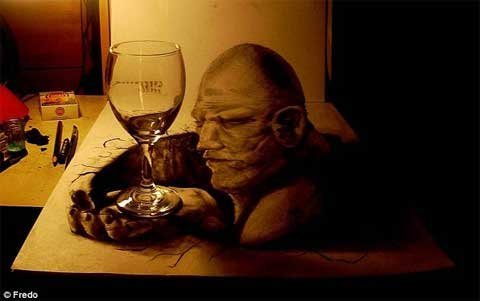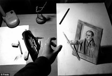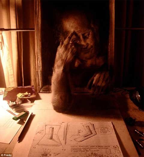 Sau khi bổ sung phần bóng bằng bút chì, Fredo chụp một tấm ảnh
