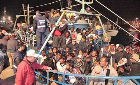 | Bảo vệ bờ biển Italy kiểm tra khi người tị nạn châu Phi tới Lampedusa. (Ảnh: EPA) |