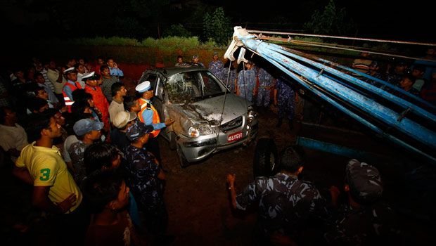| Nhân viên cứu hộ ở Nepal đang cố gắng di chuyển chiếc xe bị phá huỷ sau khi bức tường tại Đại sứ quán Anh bị sụp đổ. (Ảnh: AP) |