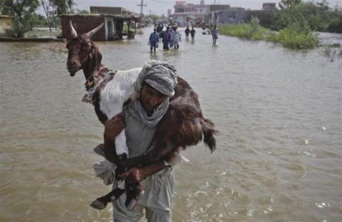 Một người đàn ông Pakistan mang theo vật nuôi duy nhất còn lại của gia đình mình ra khỏi ngôi làng ngập nước. (Ảnh: Reuters)