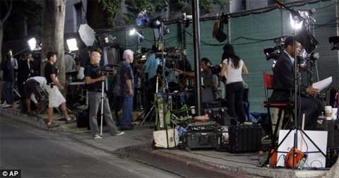 Báo chí lắp đặt máy móc bên ngoài tòa để tiện cho việc đưa tin về phiên xử