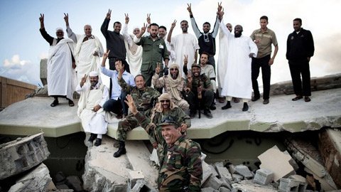 | Binh sỹ NTC và dân thường Libya ăn mừng khi dinh thự Bab al-Aziziya bị san phẳng. (Ảnh: Getty) |