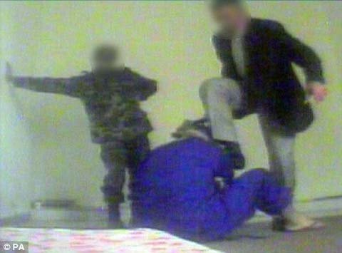 Một tù nhân bị đá vào đầu bởi một quan chức khi một bảo vệ nhà tù đứng nhìn.