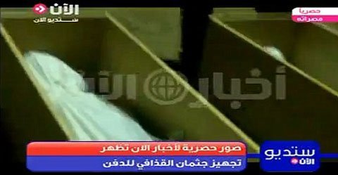 Hãng truyền hình Al Alaan có trụ sở tại Dubai khẳng định rằng đây là những hình ảnh trong tang lễ Đại tá Gaddafi, con trai ông Mutassim và cựu Bộ trưởng Quốc phòng Abu Bakr Yunis trước khi được đưa đi chôn ở một địa điểm bí mật trên sa mạc Sahara diễn ra gần Misrata ngày 25/10.