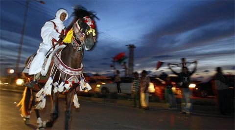 Các cư dân Benghazi ăn mừng chiến thắng trước nhà cố lãnh đạo Muammar Gaddafi và