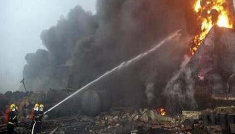 Lính cứu hỏa dập lửa tại một nhà máy hóa chất ở Trung Quốc. |