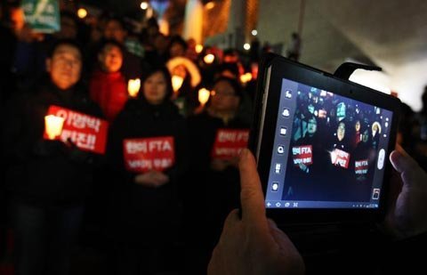 | Hôm 26/11, hơn 1.000 người Hàn Quốc xuống đường ở Seoul phản đối FTA Mỹ - Hàn. (Ảnh: THX) |