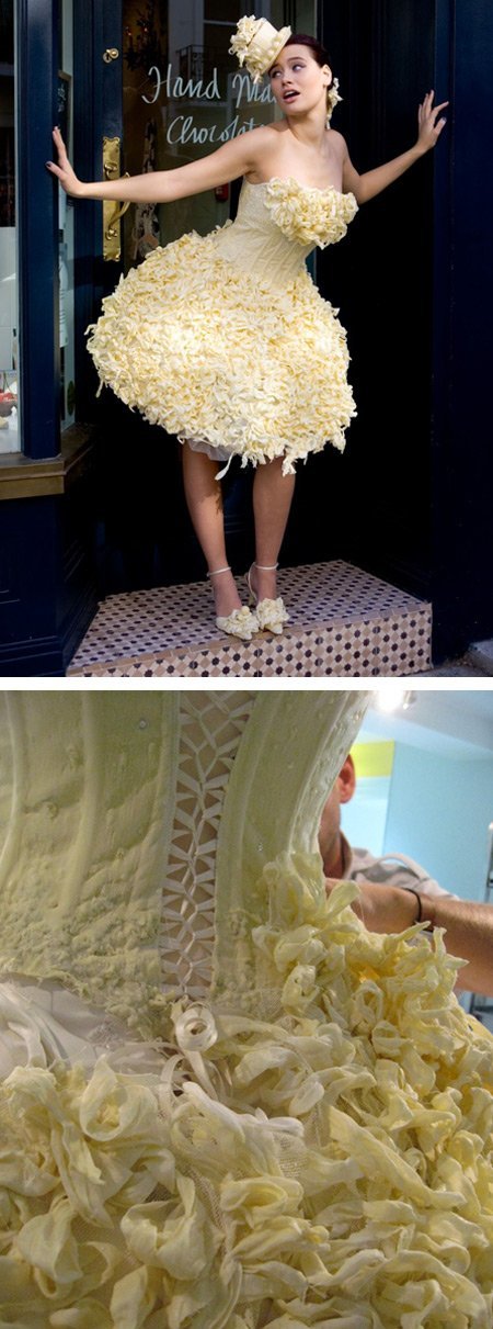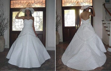 Được làm từ keo dính, giấy vệ sinh và dây băng, chiếc váy cưới do Ann Kagawa Lee thiêt kế khiến các cô dâu không kém phần quyến rũ.