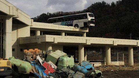 Trong ảnh, chiếc xe bus "bay" lên nóc ngôi nhà tại Ogatsu, Ishinomaki, tỉnh Miyagi trong thảm họa kép vẫn neo đậu suốt từ đó tới nay.