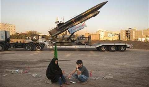 Một cặp đôi Iran ngồi nghỉ gần một tên lửa Zelzal chế tạo trong nước tại một triển lãm chiến tranh do Vệ binh Cách mạng Iran tổ chức để kỷ niệm cuộc chiến Iran-Iraq (1980-88) ở miền nam Tehran ngày 26/9/2011.