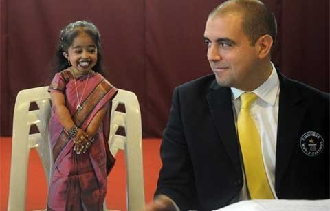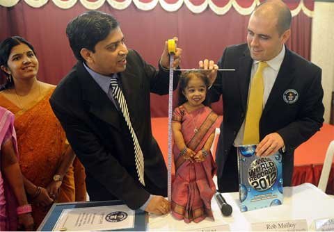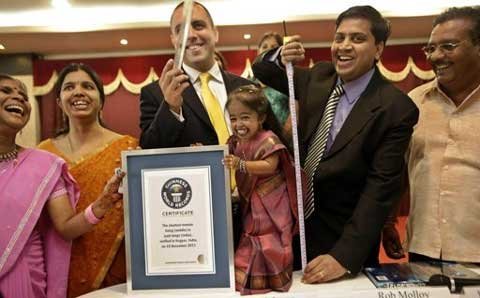 Jyoti Amge, chỉ cao 62,8cm - thấp hơn chiều cao trung bình của một đứa trẻ 2 tuổi, khi được các đại diện của Guinness từ London tới đo trong một buổi lễ có 30 người họ hàng và bạn bè cô ở thành phố Nagpur, bang Maharashtra tới dự.