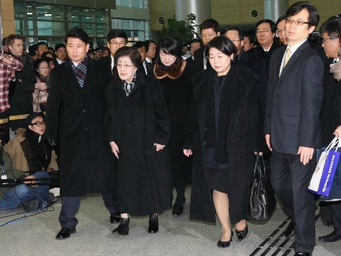| Cựu Đệ nhất phu nhân Hàn Quốc Lee Hee-Ho (thứ hai từ trái qua) tới viếng nhà lãnh đạo Triều Tiên Kim Jong-il. (Ảnh: THX) |