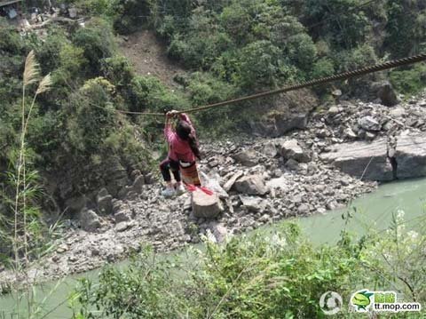 Đu dây qua sông là một thực trạng lâu nay ở thung lũng Nujiang, phía bắc tỉnh Vân Nam, nơi mà hàng ngày, 60 học sinh gan dạ phải đu dây qua sông Nu để tới trường.
