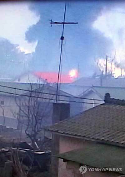 Nhà cửa trên đảo Yeonpueong bốc cháy