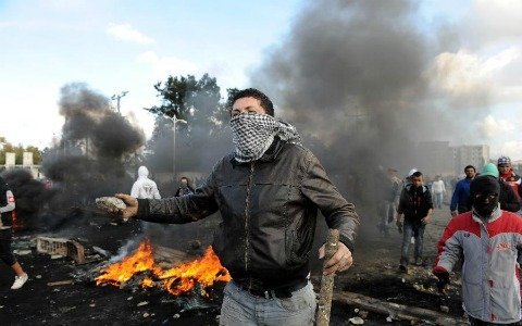 | Một người biểu tình ném đá về phía lực lượng chống bạo động trong một cuộc xô xát ở Cheraga, Algeria hôm 31/1. (Ảnh: THX) |