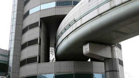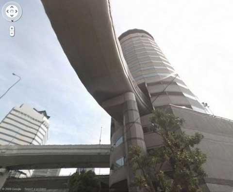 Con đường không tiếp xúc với tòa nhà và nó xuyên qua tòa nhà như một cây cầu vượt, được trợ lực bởi những cấu trúc gần tòa nhà.