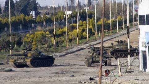 Xe tăng Syria tại Bab Amro gần thành phố Homs ngày 12/2. (Ảnh: Reuters)