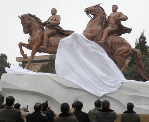Một bức tượng đồng cao 6 mét mô phỏng cố Chủ tịch Kim Jong-il cưỡi ngựa cạnh lãnh tụ Kim Nhật Thành vừa được khánh thành vào hôm thứ Ba (14/2).