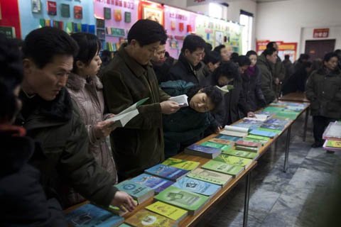Người dân xem sách viết về nhà lãnh đạo quá cố. (Ảnh: KCNA)