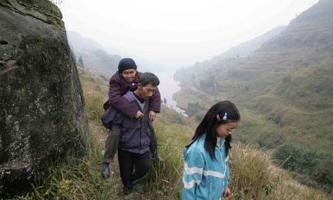 Xie cõng vợ đi thăm bạn bè, đi trước là cô con gái mà họ nhận nuôi. (Ảnh: CFP)