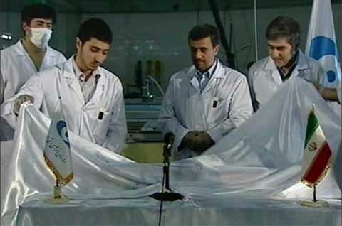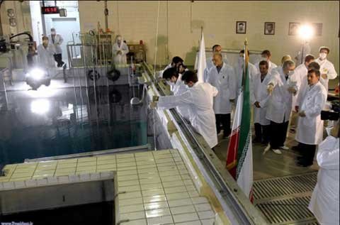 Tổng thống Iran Mahmoud Ahmadinejad đứng cạnh các nhà khoa học để xem một thanh nhiên liệu tại Lò phản ứng nghiên cứu Tehran ở Tehran khi tuyên bố nước này đã đạt được nhiều tiến bộ về công nghệ hạt nhân.