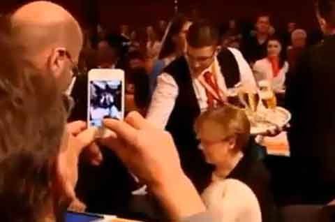 Anh chàng bồi bàn không biết rằng những cốc bia sắp đổ lên người bà Angela Merkel.