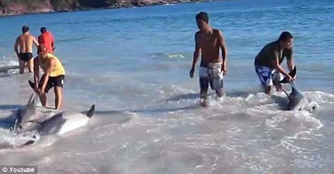 Mặc dù sửng sốt trước sự "viếng thăm" đột ngột này, nhưng chỉ vài giây sau, mọi người đã kịp nhận ra sự nguy hiểm đối với những con cá khổng lồ và nhanh chóng chạy xuống biển để giúp đỡ chúng.
