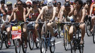Hàng trăm người đi xe đạp đã khỏa thuân và tuần hành trên đường phố thủ đô Lima của Peru để kêu gọi sự chú ý tới các điều kiện an toàn trên đường phố.
