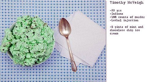 Trong khi đó, một kẻ giết người hàng loạt là Timothy McVeigh, 33 tuổi lại muốn ăn gần 1 lít kem bạc hà và sô-cô-la hạt rắc trên kem.