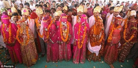 Khoác lên mình bộ sari màu hồng rực rỡ và những trang sức bằng vàng sáng chói, các bé gái ngồi khép nép bên những chú rể và vị hôn thê đội khăn xếp vàng khi một giáo sỹ Hindu tụng kinh Vệ đà.