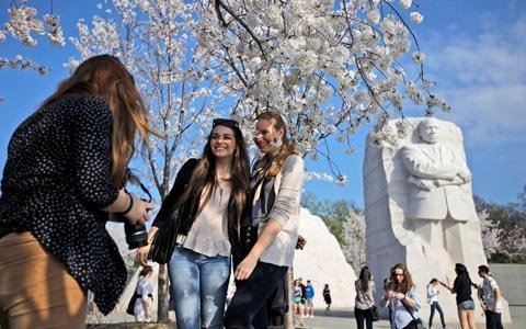 Khách du lịch bước bộ dưới những cây anh đào nở rộ gần Đài tưởng niệm Martin Luther King. (Ảnh: Reuters)