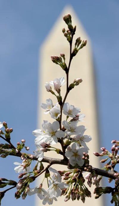 Những cánh hoa anh đào bên Washington Monument (Ảnh: EPA)