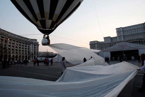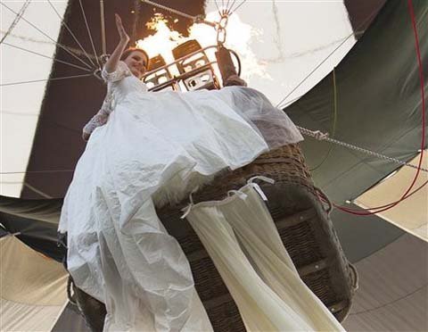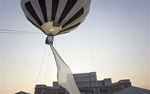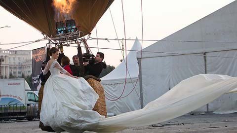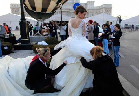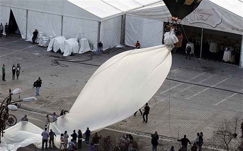Sự kiện trình diễn đuôi váy cưới dài nhất thế giới trên khinh khí cầu diễn ra vào hôm thứ Ba (20/3) vừa qua do công ty thời trang Andree Salon và các nhà tổ chức của Hội chợ Cưới diễn ra tại Bucharest vào tháng sáu năm nay phối hợp thực hiện.