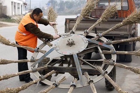 đường được làm từ 16 cây chổi rơm được gắn trên một đĩa sắt có thể quay tròn khi