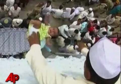 Đoạn video về một buổi lễ vào năm 2009 cho thấy những tu sĩ mặc áo choàng lắc lư những đứa trẻ trước khi ném chúng xuống bên dưới, nơi khoảng 14-15 người đang căng một tấm vải để hứng.